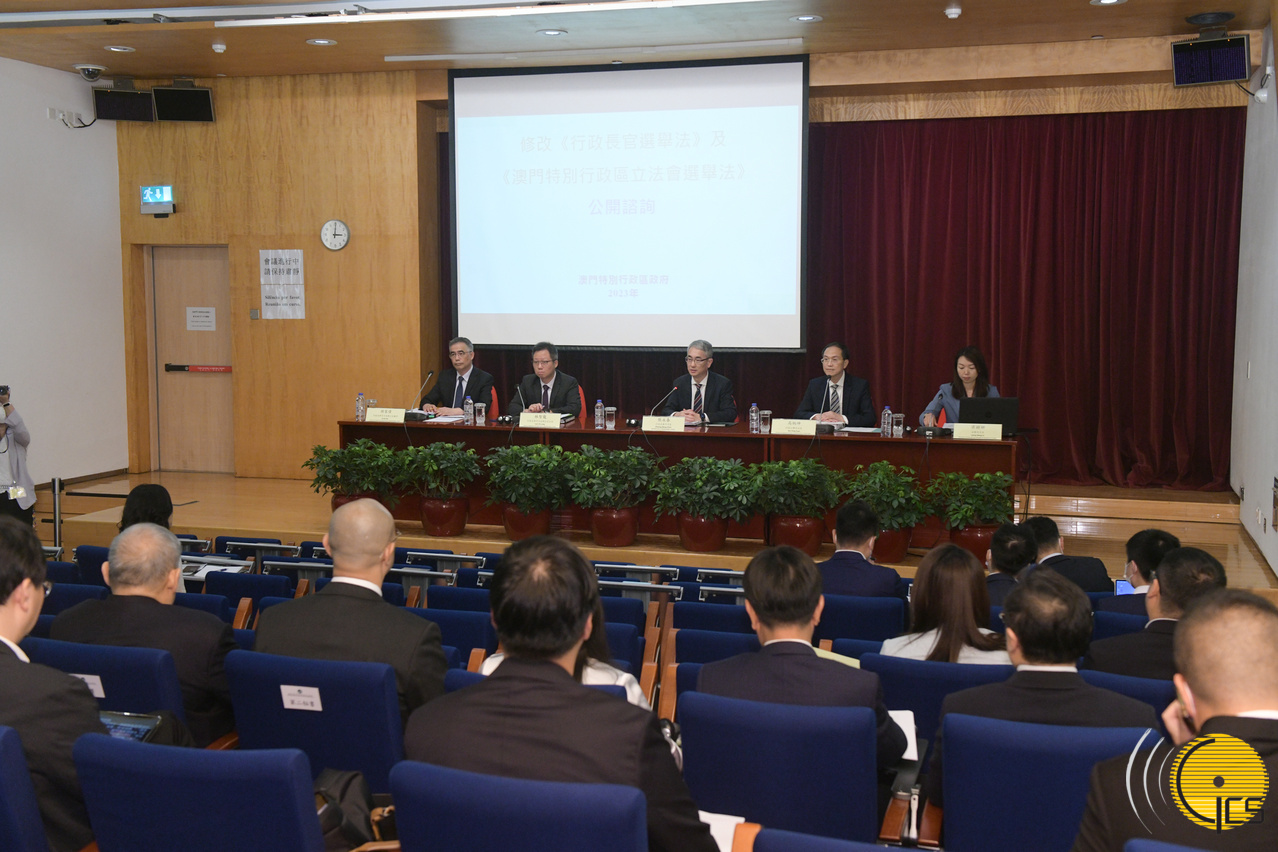 O Governo da Região Administrativa Especial de Macau (RAEM) realizou, hoje (dia 23), pelas 15:00 horas, na Assembleia Legislativa, a 3.ª sessão de consulta pública sobre a revisão da Lei Eleitoral para o Chefe do Executivo e da Lei Eleitoral para a Assembleia Legislativa da Região Administrativa Especial de Macau, no sentido de auscultar opiniões e sugestões dos deputados à Assembleia Legislativa relativamente à revisão das referidas leis. A sessão de consulta foi presidida pelo Secretário para a Administração e Justiça, Cheong Weng Chon e contou com a presença do chefe do Gabinete do Secretário para a Administração e Justiça, Lam Chi Long, do director da Direcção dos Serviços de Administração e Função Pública (SAFP), Kou Peng Kuan, da directora da Direcção dos Serviços de Assuntos de Justiça (DSAJ), Leong Weng In e do assessor do Gabinete do Secretário para a Administração e Justiça, Vu Ka Vai.