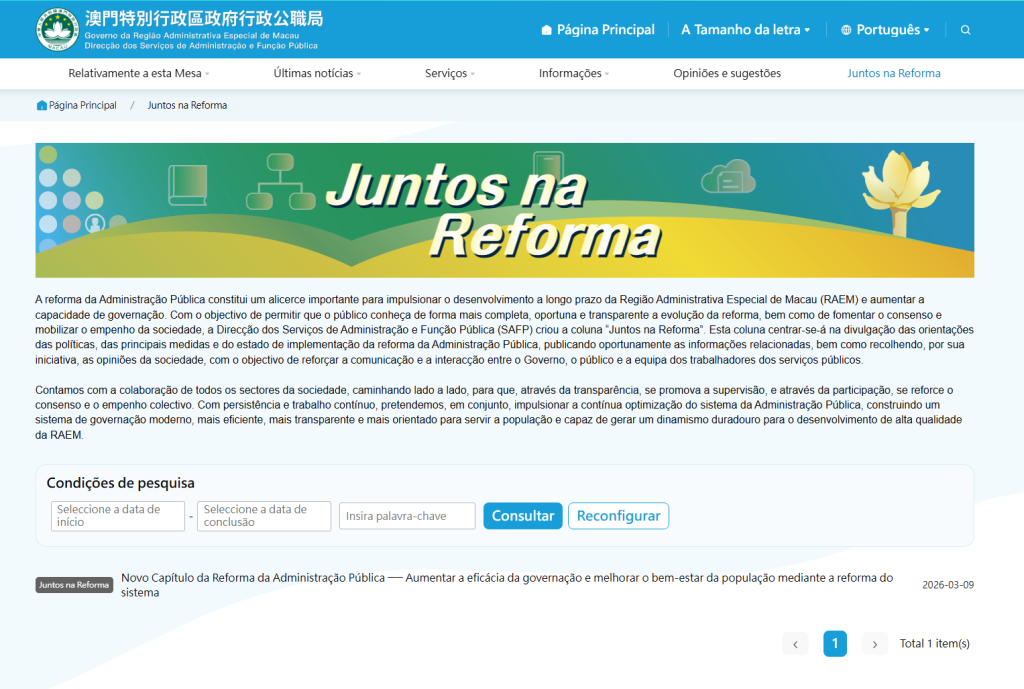 Com o objectivo de reforçar ainda mais a transparência da reforma da Administração Pública e a participação da sociedade, a partir do dia 9, a página electrónica da Direcção dos Serviços de Administração e Função Pública (SAFP) (www.safp.gov.mo/pt/home) passa a disponibilizar a coluna “Juntos na Reforma”. Esta iniciativa visa transmitir atempadamente ao público e à equipa dos trabalhadores dos serviços públicos informações sobre a reforma, reunindo o consenso e o empenho social para, em conjunto, impulsionar a modernização do sistema e da capacidade de governação da Região Administrativa Especial de Macau (RAEM).